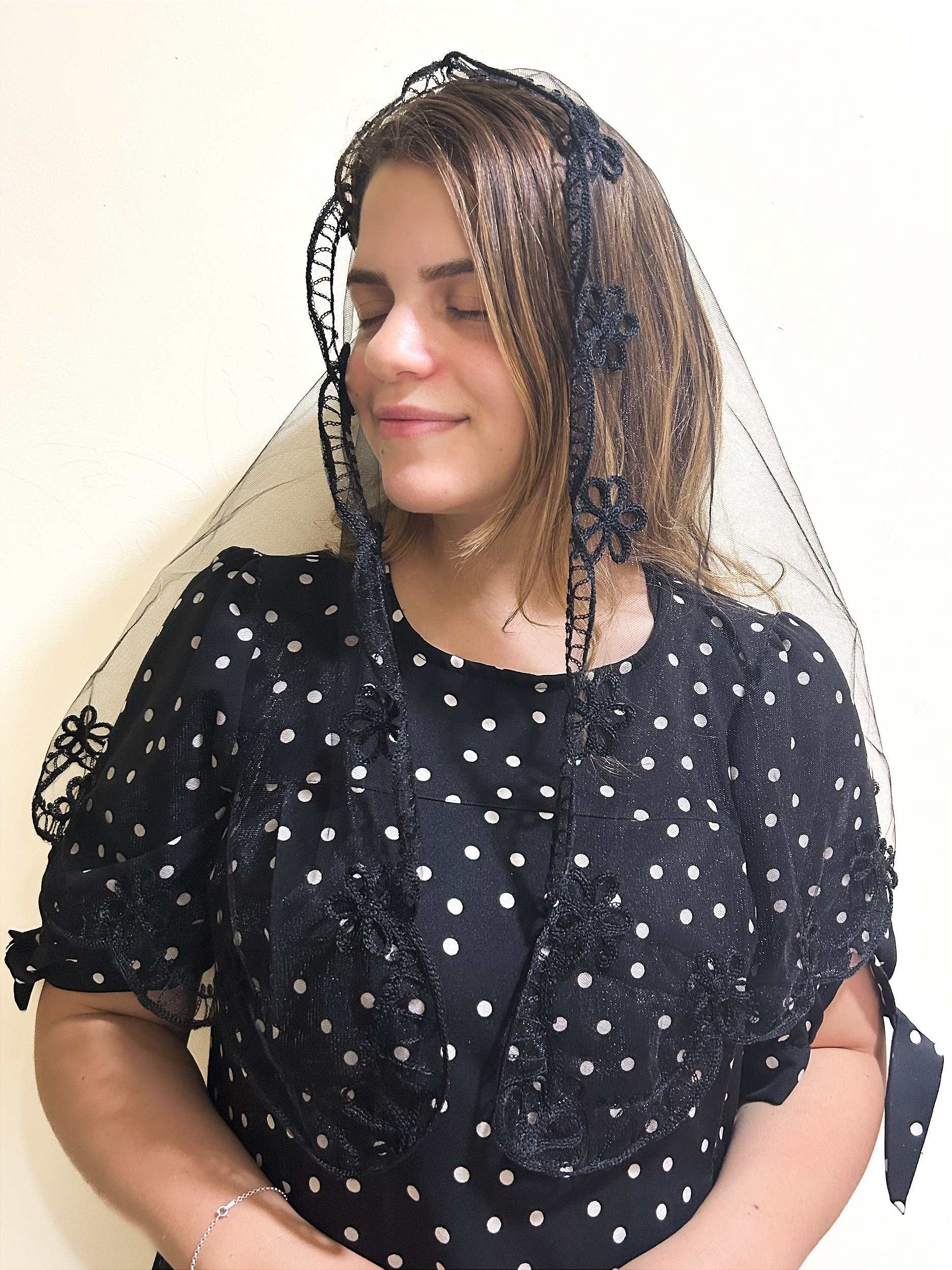 Véu em tule bordado com barrado também bordado e formato oval.