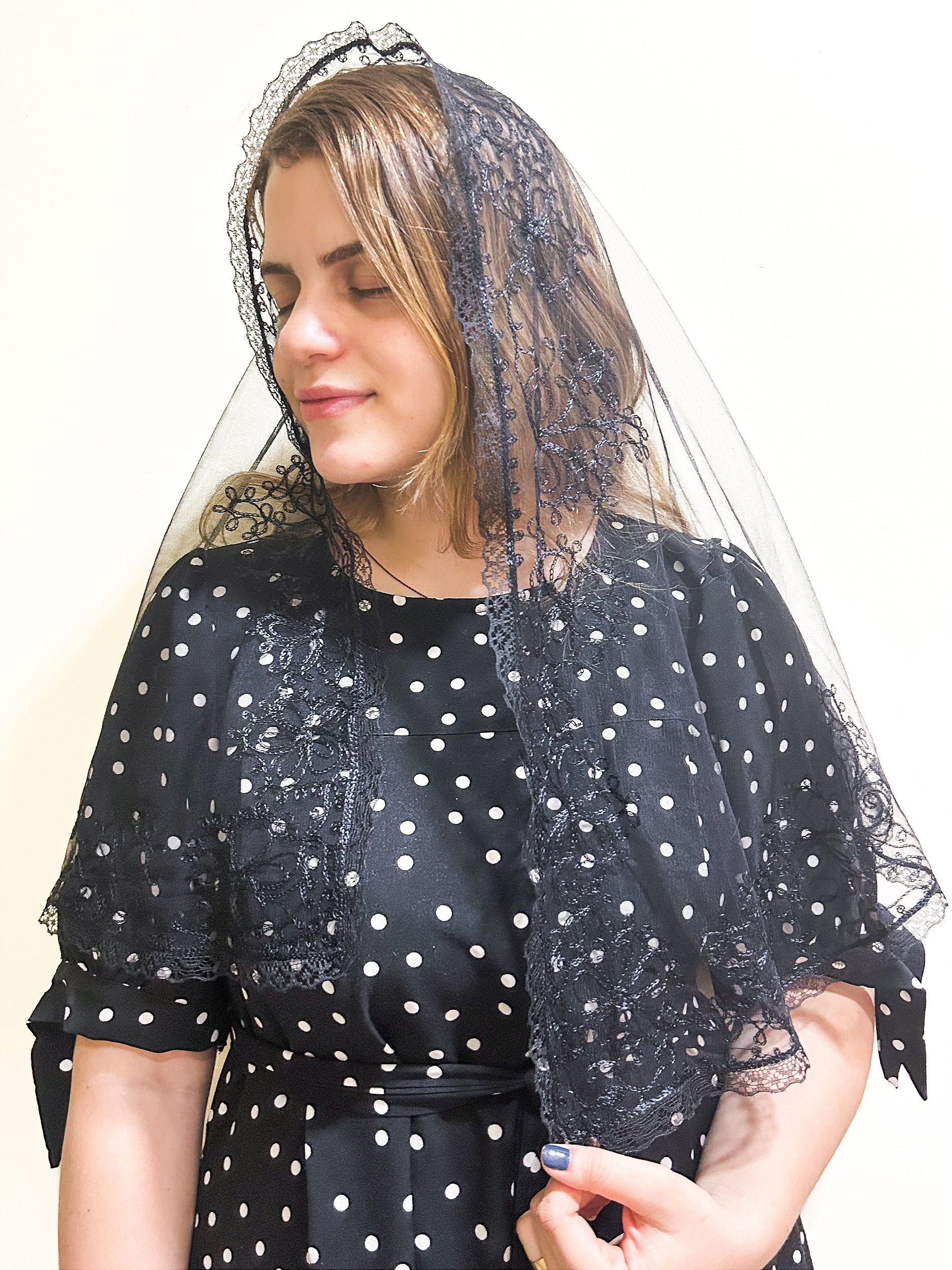 Véu bordado com fios de seda em tule preto