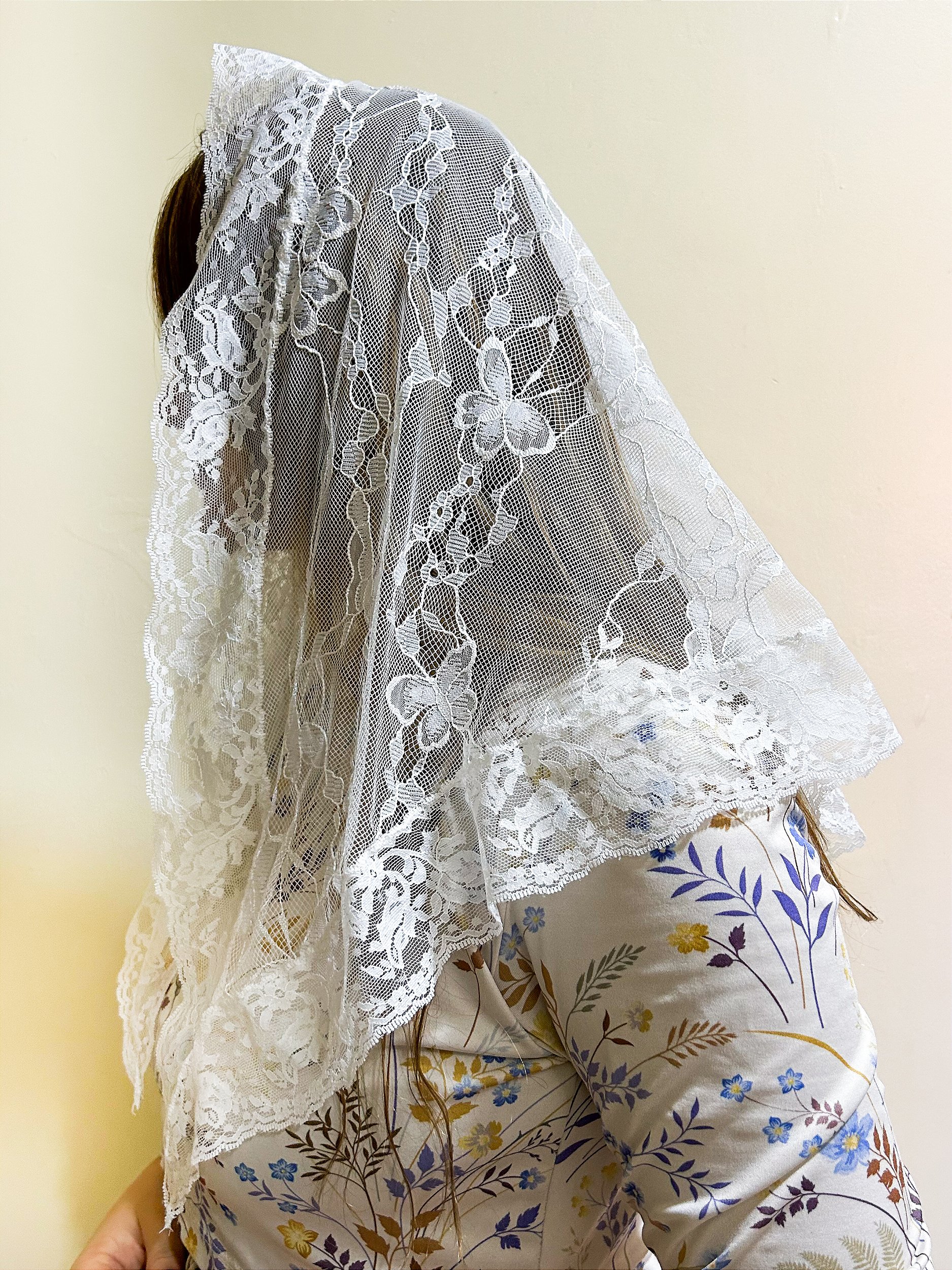 Véu em renda chantilly com barrado de renda de poliamida
